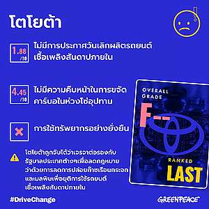 บริษัทผู้ผลิตรถยนต์รายใหญ่ของโลกล้มเหลวต่อการปกป้องสภาพภูมิอากาศโลก โดยหนึ่งในบริษัทที่น่าผิดหวังที่สุดคือโตโยต้า มีข้อมูลจากรายงานล่าสุดกรีนพีซเอเชียตะวันออกเปิดเผยว่า บริษัทผู้ผลิตรถยนต์รายใหญ่ 10 แห่งซึ่งครอบคลุมตลาดถึง 80% ไม่ได้ทำหน้าที่ของตัวเองเท่าที่ควรเพื่อแก้ไขวิกฤตสภาพภูมิอากาศ